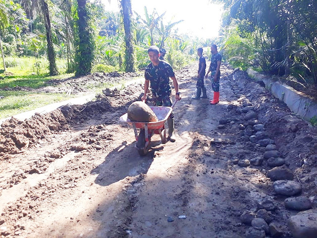 Betapa tidak, hanya dengan menggunakan angkong dan cangkul, personel Satgas tetap ikhlas menyingkirkan material batu koral ukuran puluhan kilo dari badan jalan yang hendak dicor rigid beton.