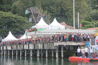INILAHMEDAN - Parapat: Ribuan pengunjung menyaksikan jalannya lomba cabang olahraga (cabor) renang perairan terbuka PON XXI, yang digelar di Pantai perairan Danau Toba, Wisata Bahari Parapat, Simalungun, Selasa (10/09/2024).